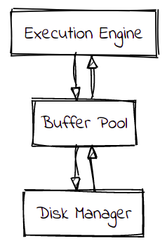 The execution engine requests pages from the buffer pool by providing a page identifier. It can read the content of the page and send the data to the client. Or it can modify the content of the page and send it back to the buffer pool so that the change can be persisted. The execution engineaccess the buffer pool thinking that it is accessing the disk.