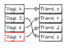 The above image indicates the two data structures used for implementing a buffer pool: a frame array and a page table. The image represents a buffer pool that can cache a maximum of 4 pages. The pages being cached are 4, 5, 6, and 7. The arrows indicate where the page can be found in memory (in the array of frames). Let’s look into another buffer pool: