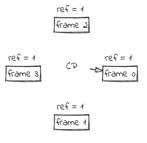 At this, we can see that there are 3 pages in cache, and one space left. The frames that are free and are ready for receiving a new page are tracked in an additional structure called free list.