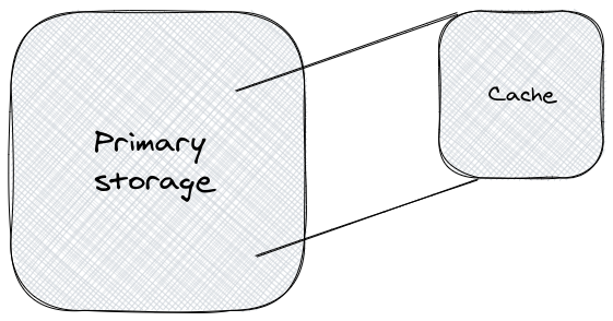 One of the main drivers of why the cache contains only a subset of the primary storage is cost. Maintaining a copy of the entire primary storage may be too costly, so we have to content ourselves with a cache of limited capacity. More importantly, by design, a cache is supposed to have small sizes. That’s because the whole purpose of caching is to optimize for data access. Most of the data is not accessed, so keeping in cache a subset of data that is frequently accessed is what allows faster look-ups. With all this in mind, let’s define cache, for the purposes of this post, as: