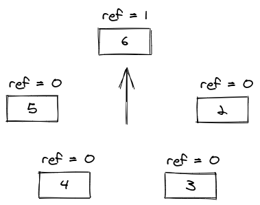 The eviction algorithm makes use of a clock pointer to traverse the circular list in search of an entry that has the reference bit set to 0 (ref = 0). Every time that it checks the reference bit, if it is set to 1, it sets it to 0 and goes for the next entry. To illustrate this, let’s look at the state of the clock after adding entry 6 at the above clock.