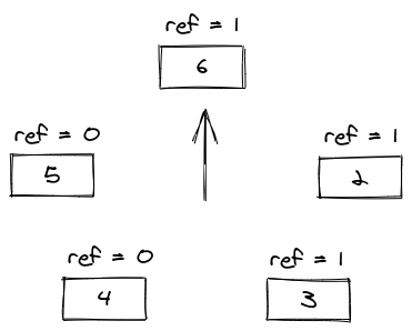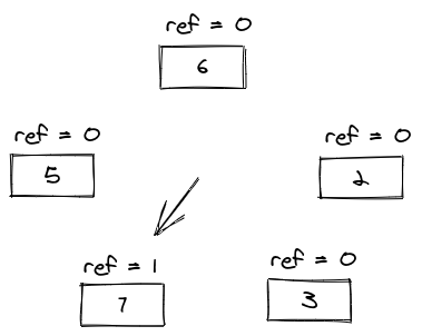 If we try to add a new entry 7 now, it will set the reference bits of 6, 2, and 3 to 0, and then evict entry 4.
