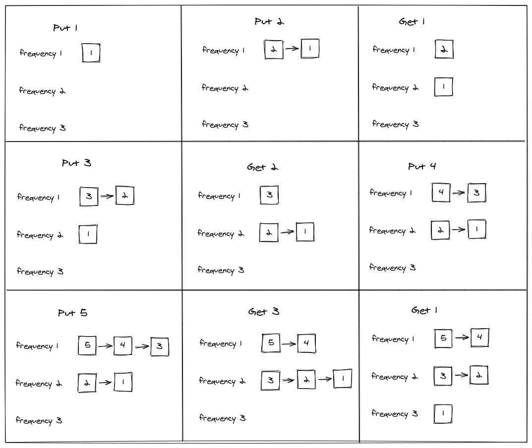 When a Get operation occurs, it follow that we need to remove the element where it currently lies and push to the front of list stored at the freqList[frequency + 1].