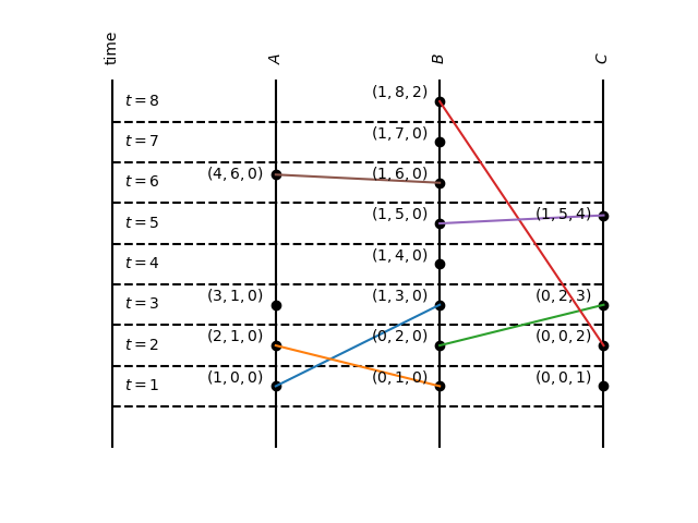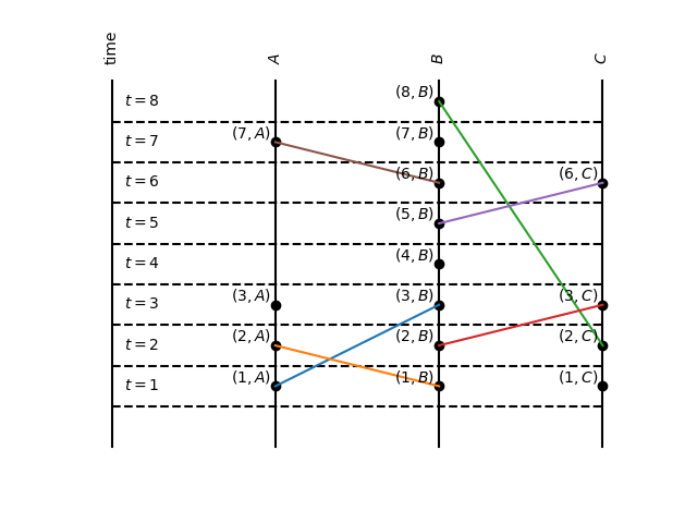 Does $ (1, A) \to (6, C)$? Yes. According to the definition, $ (1, A) $ happened-before $ (6, C) $ by transitivity. There is a sequence of events from $ (1, A)$ to $ (6, C)$: $ (1, A), (3, B)$, $(4, B)$, $(5, B)$ and $(6, C)$. Be aware that for some pair of events we can’t establish a happened-before relation according to our definition, for example, the pair $(3, A)$ and $(4, B)$. We say that these events are concurrent.